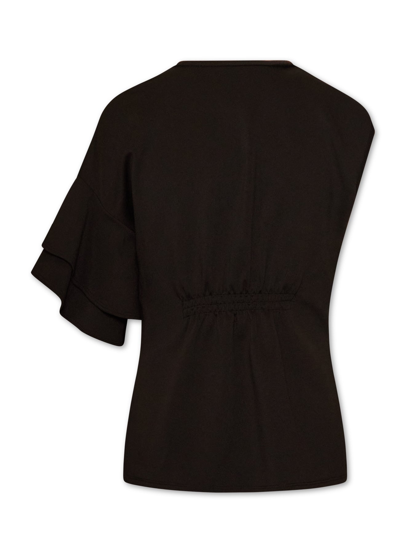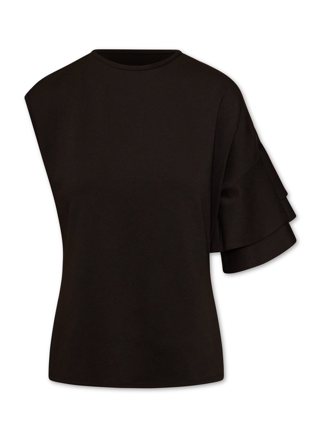 An everyday tee - with an update. The one shoulder, ruffle sleeve is the perfect update to your core wardrobe. Giving ease and elegance all at once, the Missy Tee is accented with a cinched back for an accentuated shape.