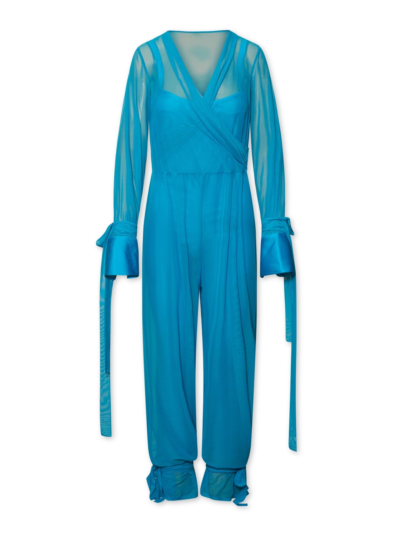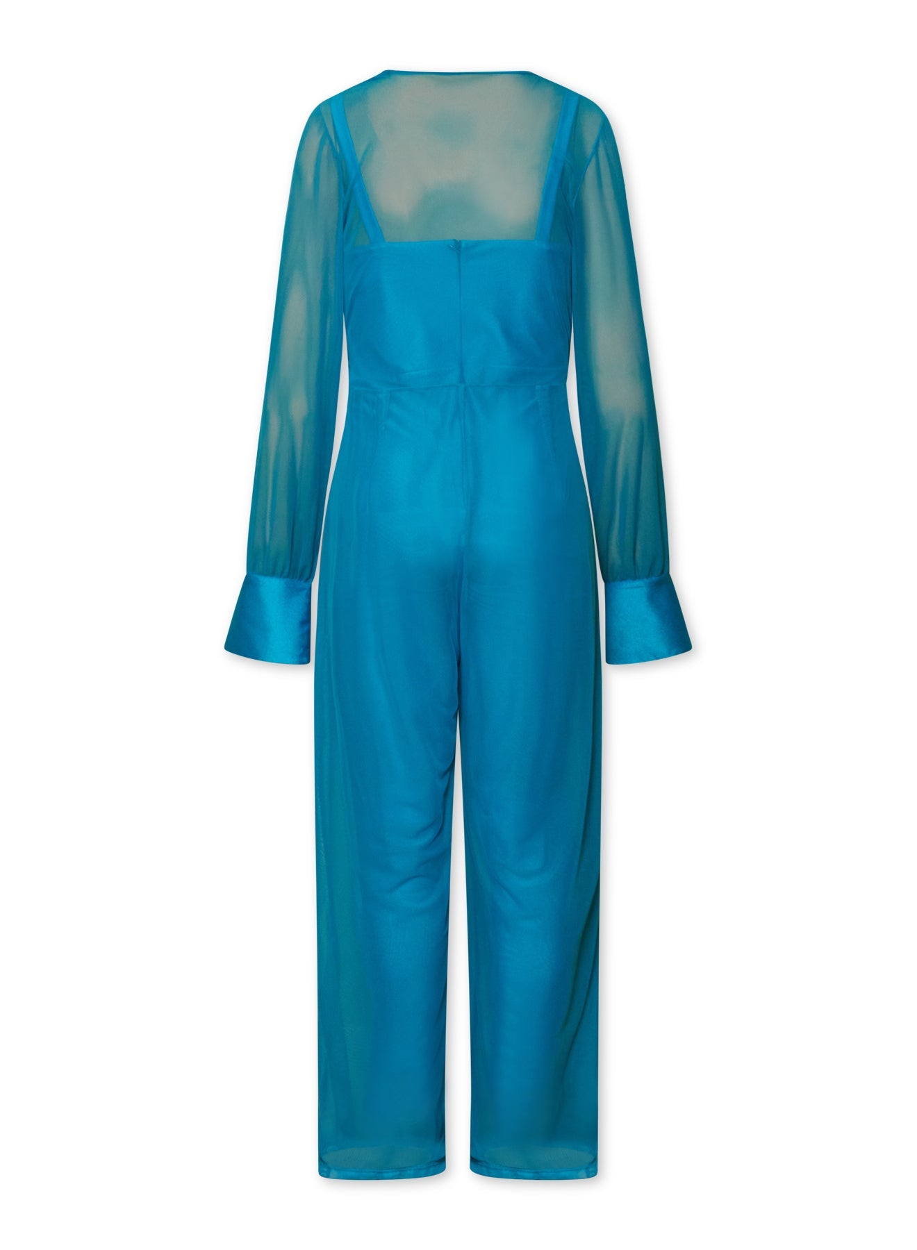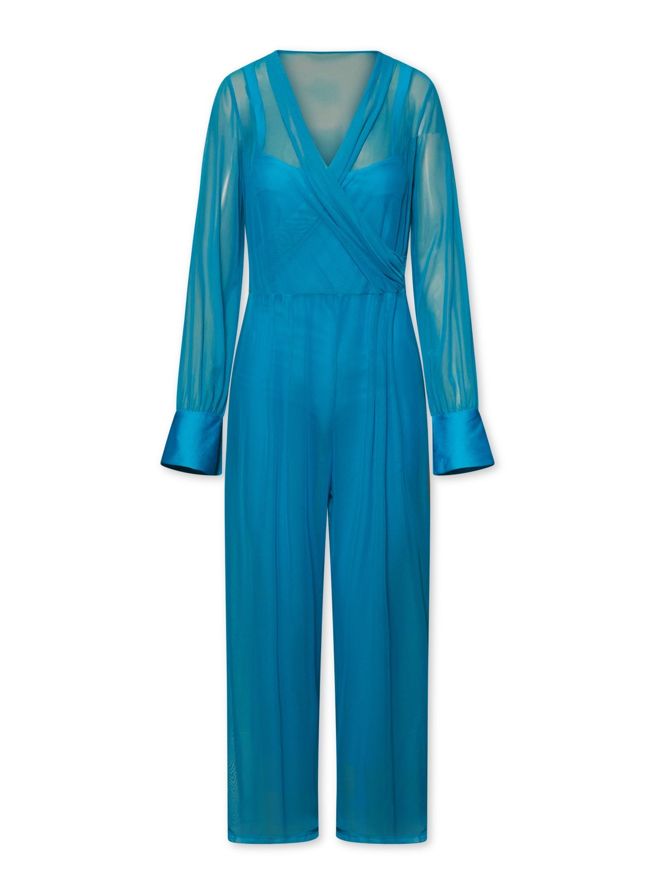 This ultra-sheer jumpsuit is guaranteed to turn heads. The Monet Jumpsuit is fitted at the waist with a blouse top and wide-leg. Accented with oversized cuffs and optional ties for style. Wear it all-in-one or wear the Malika Jumpsuit as base layer or its own as a sheer overlay with the Felicia Bralette and your favorite hot shorts.