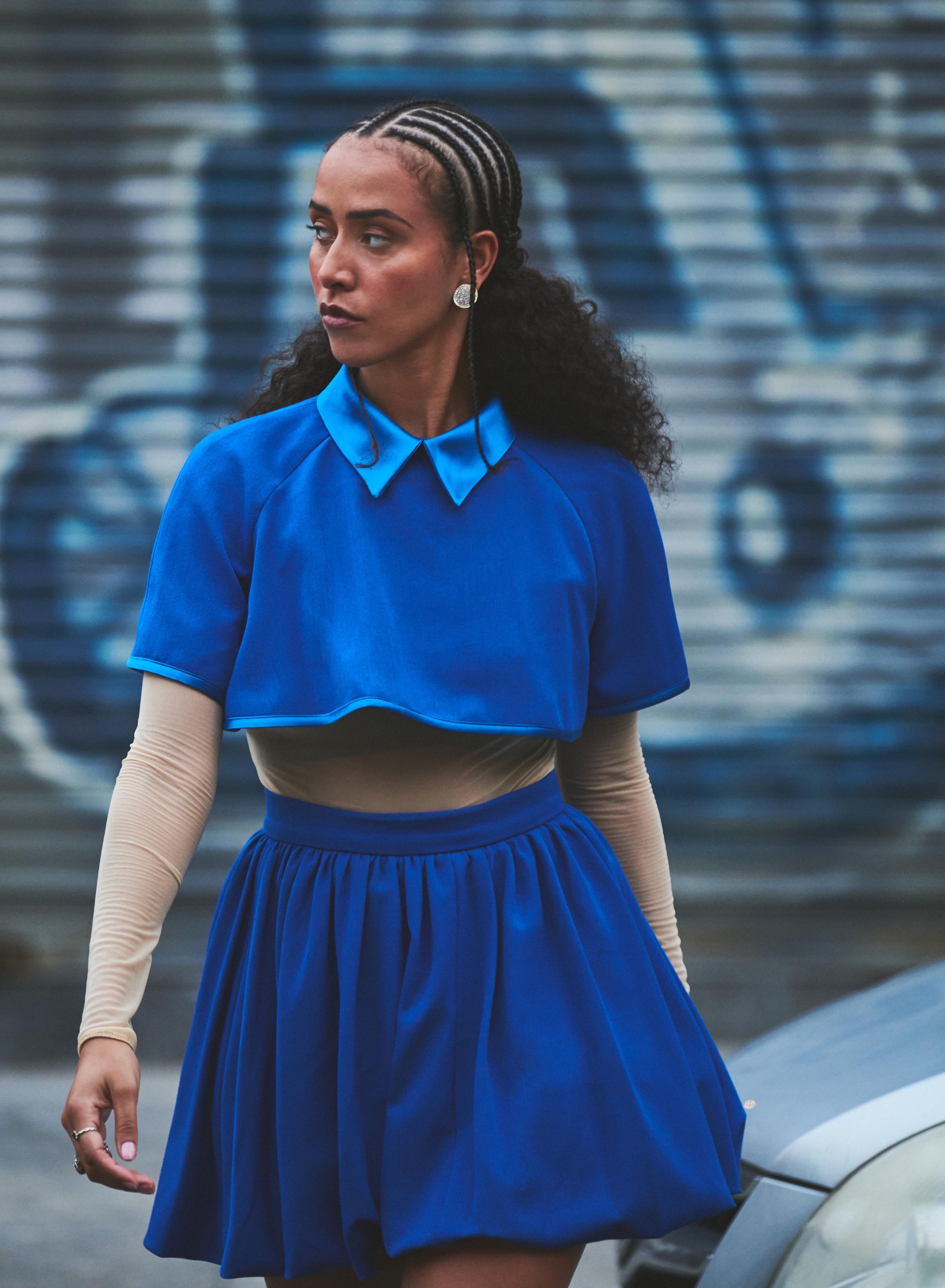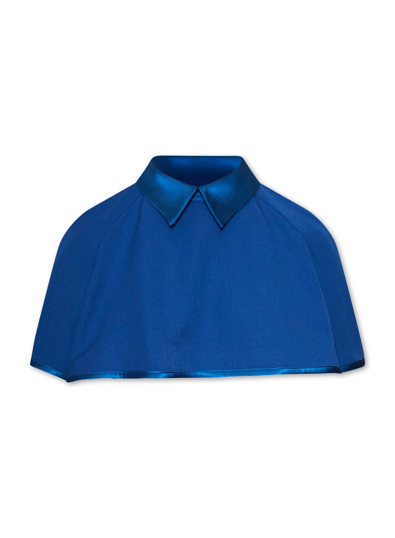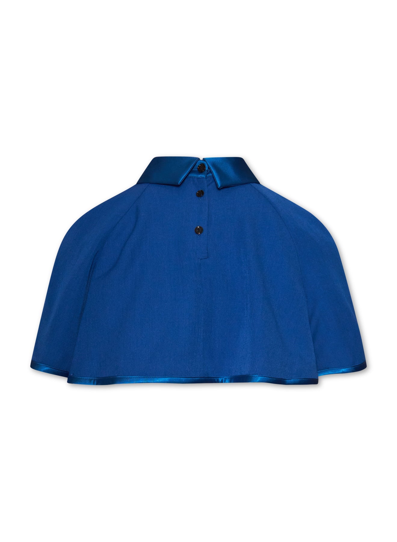 A mini mock cape. The Tlady cape flounces across the chest a mini crop top with hidden short sleeves, so it always stays in place. Accented with an oversized satin collar and 3-button back.